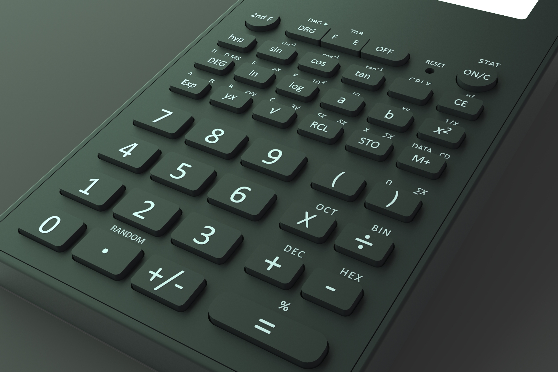 A scientific calculator with a contemporary design and adjustable tilting stand for ease of use.